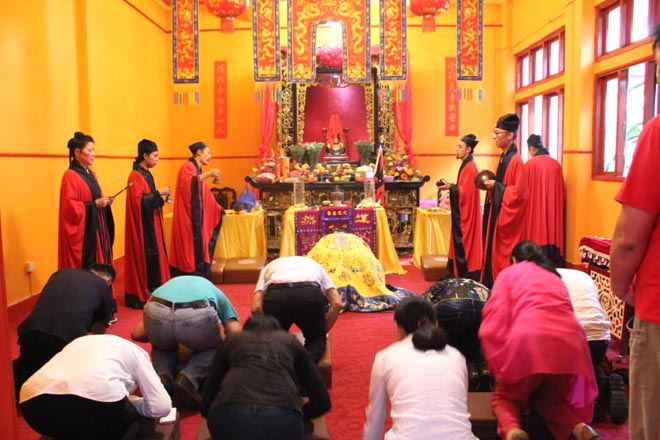 各位会长致辞结束后,在与会侨胞的见证和参与下,王道长主持了神圣的关公像开光程序环节仪式。