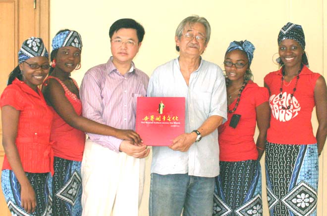 文化学者朱正明(左三)在莫桑比克向中华协会副主席任华南赠送《世界关帝文化》专著