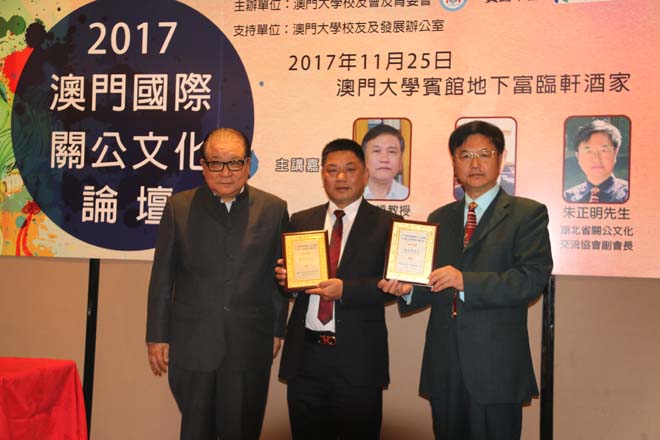 论坛开始前,澳门大学校友会主席区秉光博士发表了热情洋溢的致辞,澳门大学校友会理事长葛万金先生深情讲话,表达了澳门各界人士对中华文化的自信和崇敬。区秉光博士还为三位主讲嘉宾致送了纪念品,葛万金理事长特为中华关帝雕像专家戴正天先生致送了匾牌。