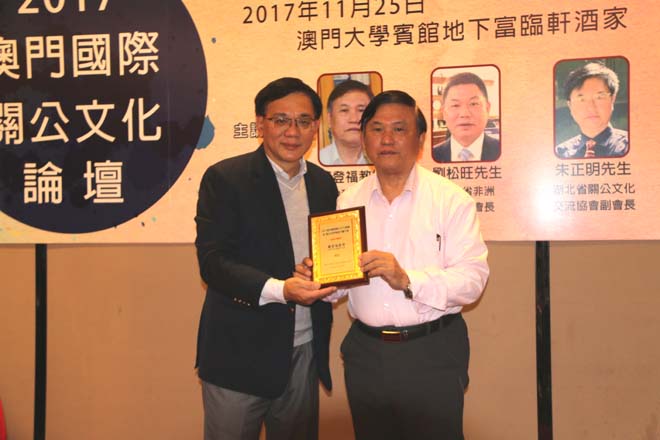 澳门大学校友会理事长、澳门国际关公文化协会理事长葛万金向台中科技大学教授萧登福致送牌匾