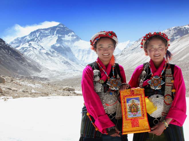 藏族姑娘在珠穆朗玛峰冰川展示关帝唐卡(朱正明 摄影)