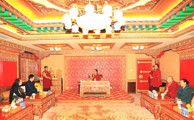 崔玉晶、朱正明拜见十一世班禅大师,汇报珠穆朗玛关帝庙重建工程(罗旦 摄影)