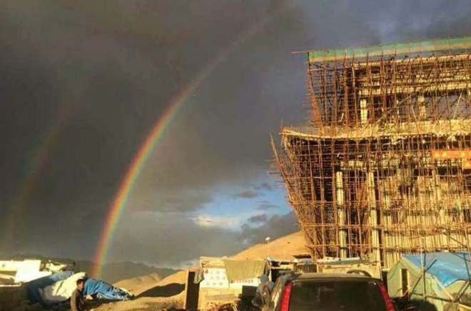 2015年农历六月二十四日,是关公诞辰之日,珠穆朗玛关帝庙建设工地升起绚丽彩虹(岗嘎 摄影)