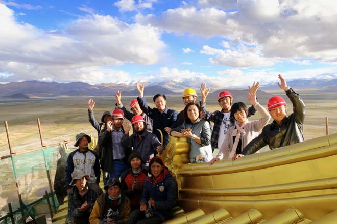 定日县县长王珅(右一)、沈阳德源集团崔玉晶董事长(右四)、湖北省委统战部海外中心主任朱正明(右六)等在珠穆朗玛关帝庙验收装修工程(岗嘎 摄影)