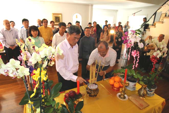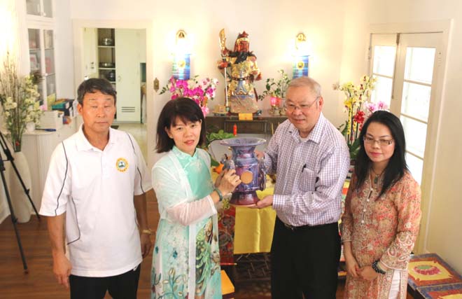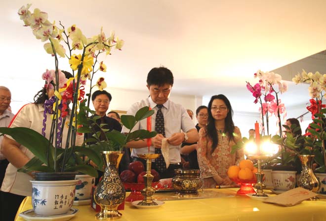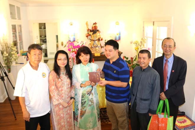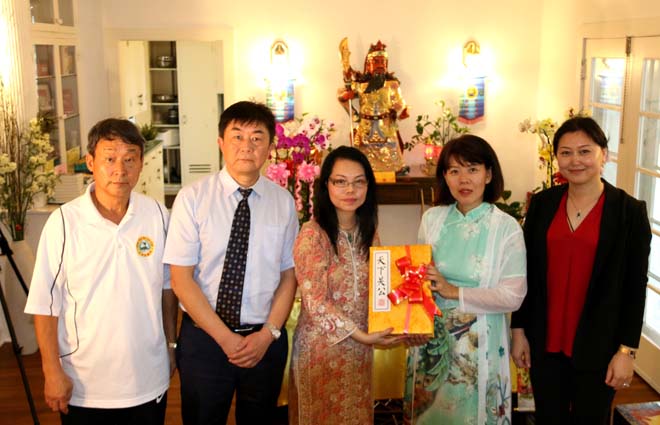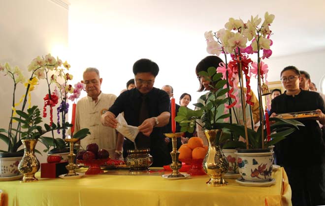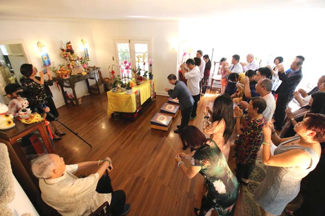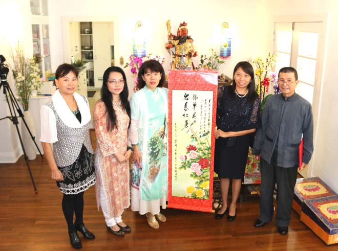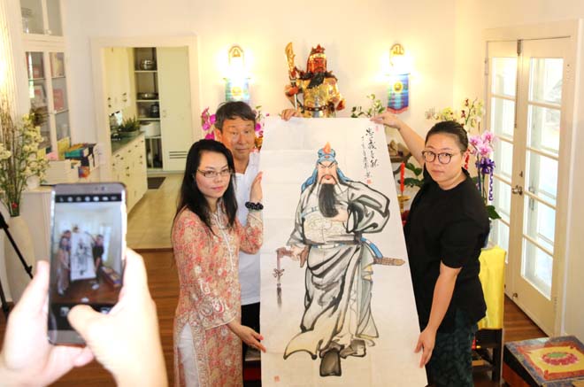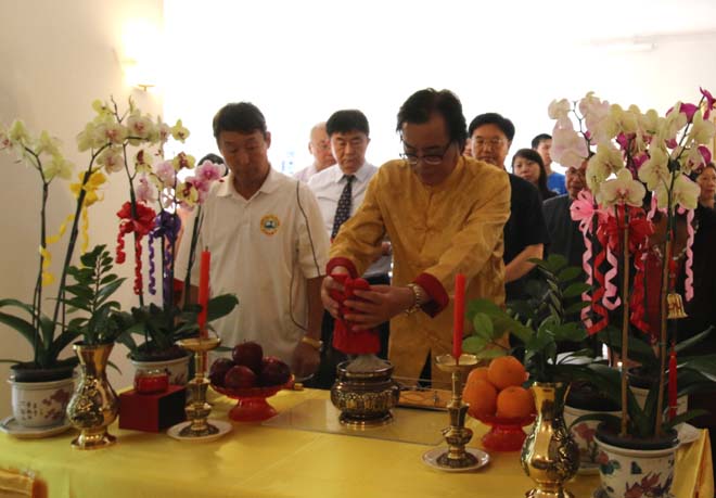 据悉,目前檀香山还没有关帝殿堂。香火汇聚仪式,选择在夏威夷侨领高振尧先生住宅大厅举行。高振尧先生现为夏威夷华文作家协会顾问,还是竹溪太极社新接班人,在夏威夷颇具知名度。他的住宅一楼,供奉着高一米的关帝陶瓷彩金像,四周鲜花密布,贡品满满。