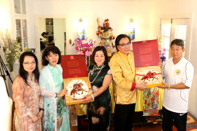 洛阳国学研究会会长张学民(右二)、执行长李霞(中)向主办单位赠送礼品,左为夏威夷华文作家协会副会长高于晴