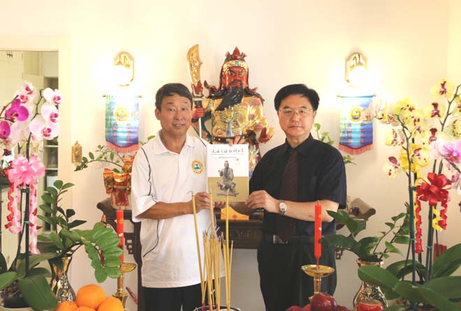 朱正明向竹溪太极社新接班人高振尧赠送《走遍天涯访关公》台湾专版