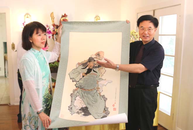 朱正明先生向夏威夷华文作家协会会长叶芳赠送关帝作品,并介绍著名画家康峰