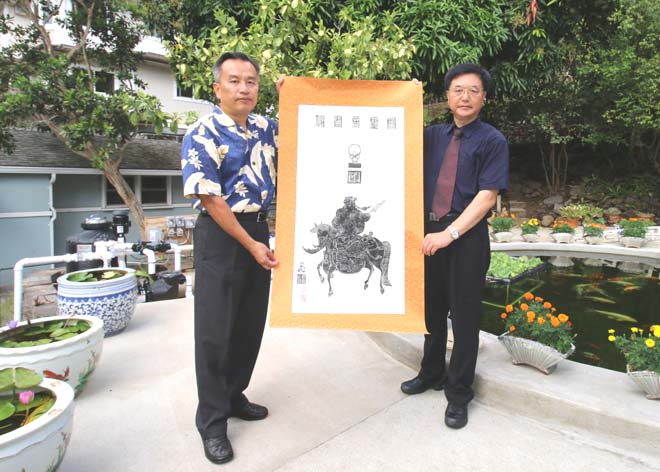 朱正明向夏威夷州众议院议会助理蒋健先生(左)赠送岳飞画关公古碑拓片