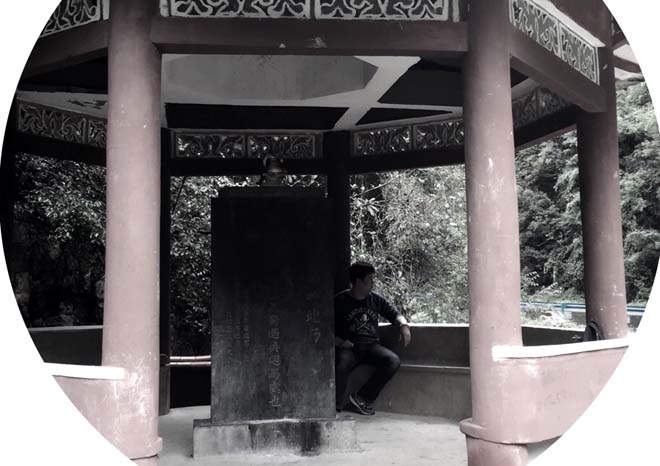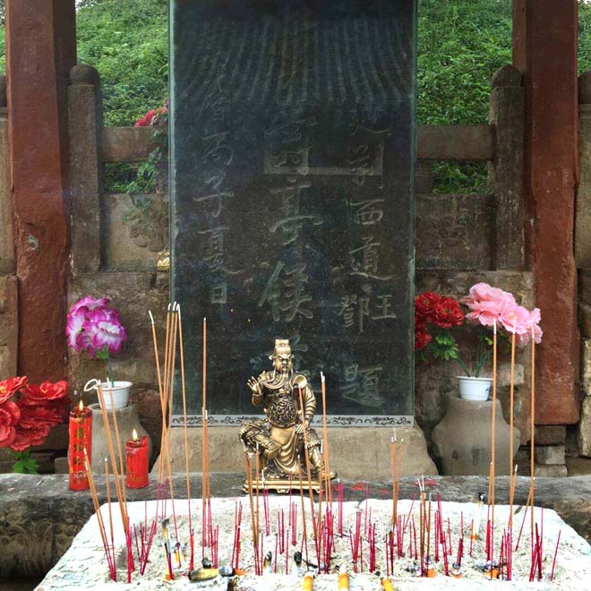 从武汉乘火车到当阳,再乘车到远安县回马坡。这里是关公当年落难之处,山高水险,崎岖难行。我们冒雨找到了回马坡碑亭,亭中遗有石碑一块,上刻“呜呼,此乃关圣帝君由临沮入蜀遇吴回马之处也。”这天刚好下雨,峡谷中河水奔流,声声作响,好似听到了一千多年前谷中的刀剑声,战马的嘶鸣声!此情此景,思绪万千,我慢慢的将关公铜像放在碑亭内,燃起一炷香,香烟袅袅而起随风飘散,这股青烟承载着故乡人对关公的无尽思念,也承载着对千年前那段往事的伤感,对着山谷,对着碑亭,对着升腾而起的青烟,心中默默地对这位从河东走来,一路披荆斩棘、含辛茹苦要复兴汉室,而又功业未成英雄扼腕的故乡人说一句:千年已逝,君可安否?