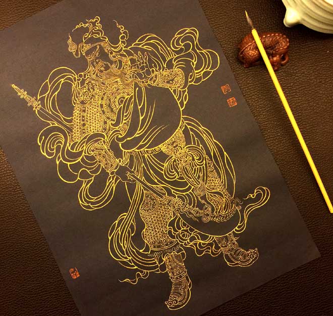 回到江城武汉,画家康峰沐手焚香,敬绘关帝圣像一幅