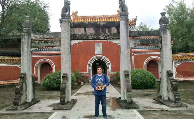 今年国庆中秋假期,我背着从山西运城关帝祖庙请来的一尊关公铜像,开始了我的朝圣之旅。这尊关公铜像,是运城解州关帝祖庙以馆藏明代铜胎泥塑彩绘关帝圣像为蓝本,用青铜铸造而成。关老爷头戴夫子巾,身着九龙袍,披黄金锁子甲,脚踩虎皮毯,形象威武庄严,制作精美,十分珍贵,为解州关帝祖庙文管所卫龙所长惠赐。我从故乡背到武汉南湖半岛家中供奉,而此次要继续背着圣像,去湖北当阳、远安,寻访当年的关公遗迹。