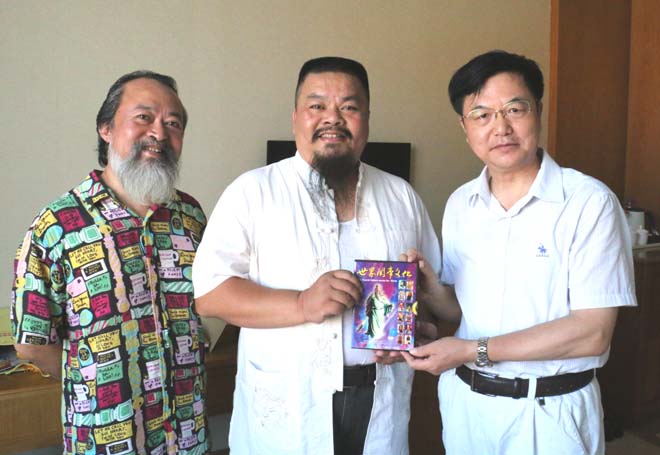 文化学者朱正明(右)向无尘赠送《世界关帝文化》,左为副会长亦菲
