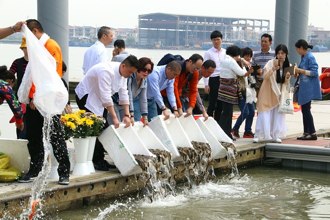 广州慧江生物科技有限公司董事长陈科桦、总经理郑悦强、副总经理卓心怡等30多位信众参加了放生法会。