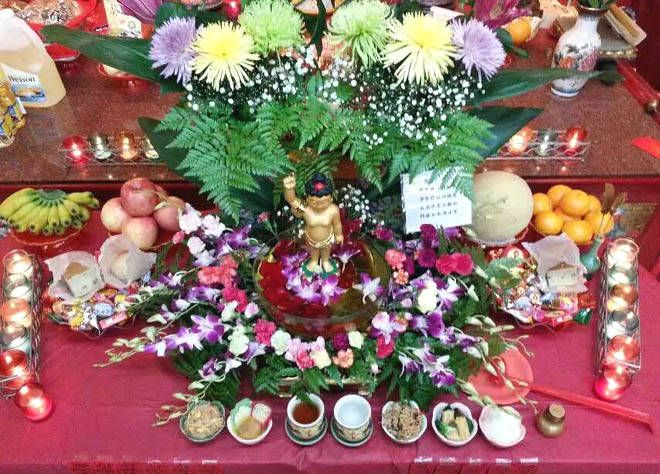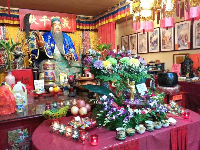 美国纽约关帝庙庆祝浴佛节,大殿神龛喜庆温馨