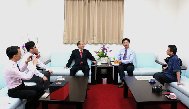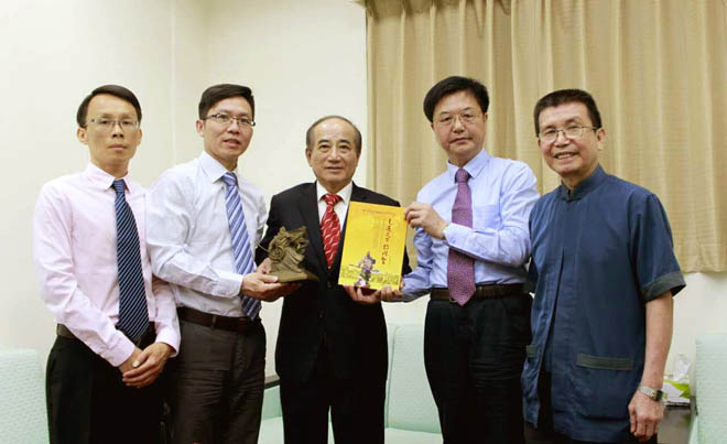 向王金平先生赠送关公专著及荆州义园关公像。左起:中国新闻社湖北分社总编艾启平,荆州关公义园文化发展股份有限公司总经理叶易源、王金平先生、文化学者朱正明、台湾中华关圣文化世界弘扬协会会长黄国彰先生