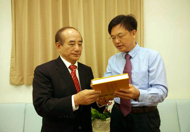 文化学者朱正明向王金平先生展示《走遍天下访关圣》专著