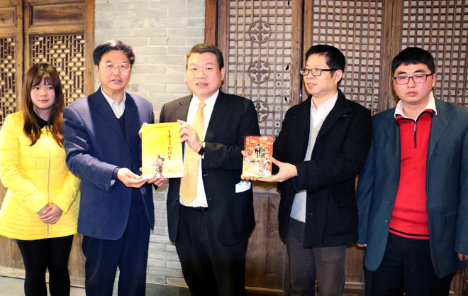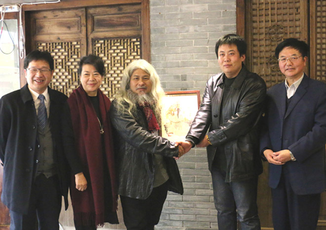青年画家康峰(右二)向台湾著名雕刻家康木祥(左三)赠送关帝画作。左一为武汉市委台办副主任张强,左二为武汉市洪山区委常委,统战部长王兰英,右一为湖北省委统战部海外中心主任朱正明
