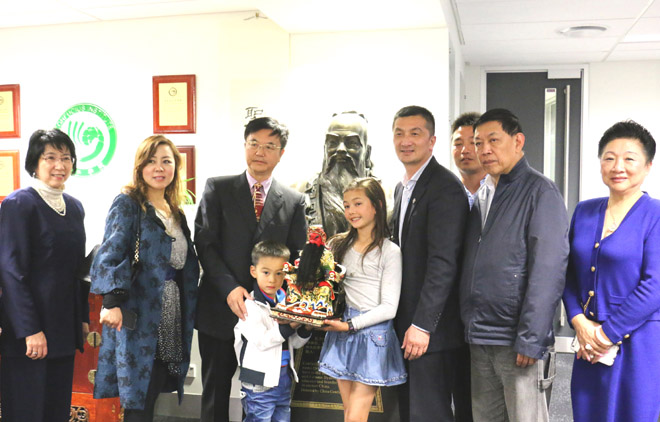 在新西兰奥克兰大学,朱正明向孔子学院院长姚载瑜(左一)、新西兰上海总商会会长严隽人(右二)、新西兰湖北商业总会会长胡弘(右三)等赠送关帝像