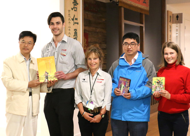 在塔斯马尼亚女皇博物馆,朱正明(左)、朱墨(右二)向博物馆Pauline(左二)、Aayon(左三)赠送《走遍天下访关圣》专著和《世界关帝文化》光盘