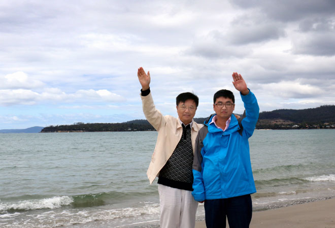 在“世界尽头”塔斯马尼亚,朱正明父子向着南极挥手