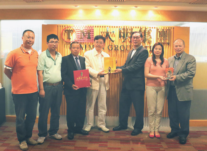 摄影家朱正明向香港大明集团董明光主席(右三)、羊福雄总经理(左三)等赠送《走遍天下访关圣》专著
