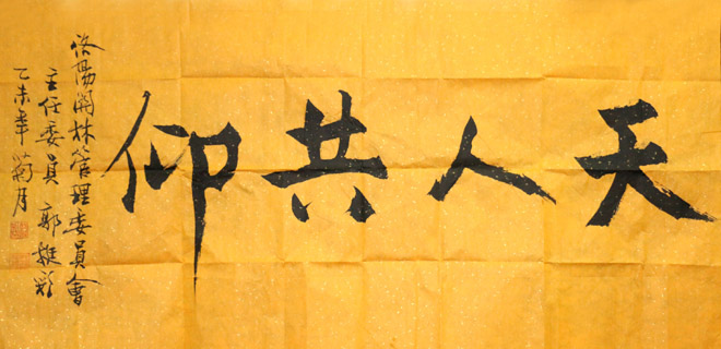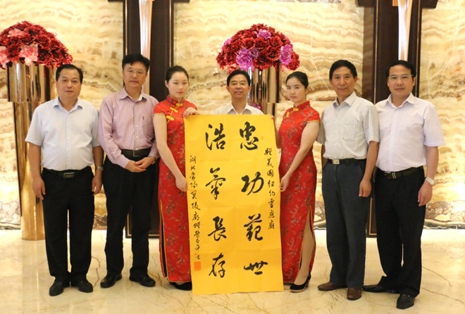 湖北当阳关陵赠送给纽约灵应庙的贺幅,作者为当阳市文联曹亚平主席(中)。右二为湖北省文联副主席耿广恩,右一为宜昌市文联党组书记黄尚荣,左二为湖北省委统战部海外中心主任朱正明,左一为当阳市委宣传部长刘祖光