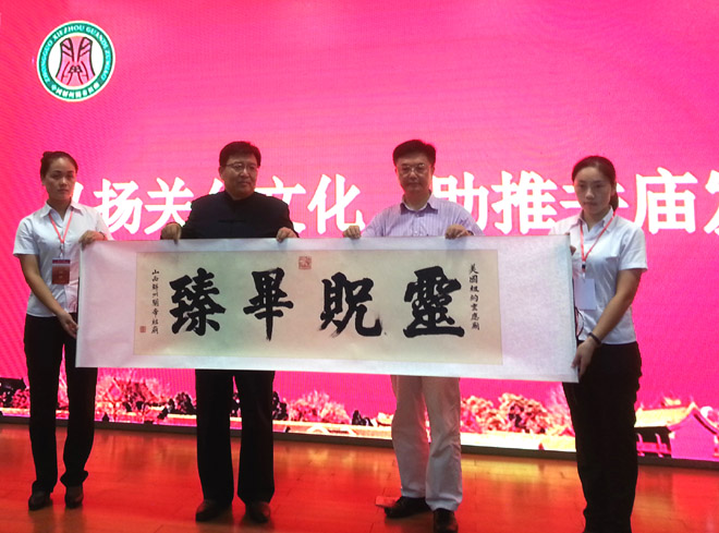 山西运城解州关帝庙赠送给纽约灵应庙的贺幅,作者为解州关帝庙文物保护所卫龙所长(左二)