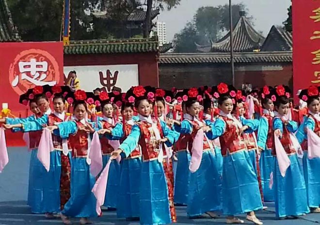 上午9时,音乐响起,一排排手持大刀的“关家军”从舞台两边快步入场,一面面战旗随着旗手的指挥烈烈风动,关家军在“关老爷”的带领下,不断变换着战阵。大刀寒光闪闪,气势如虹,展现着关家军的飒爽英姿。