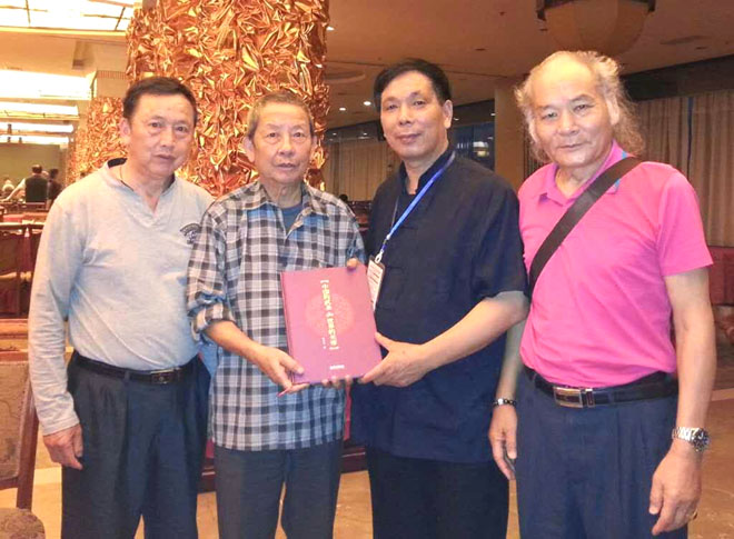 朱正明先生向法国留尼旺关帝联谊会会长周贤忠(右二)、秘书长吴广峰(右一)赠送《走遍天下访关圣》专著