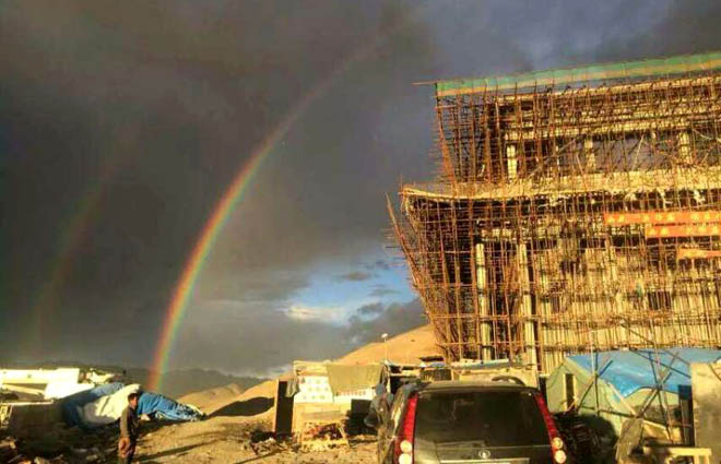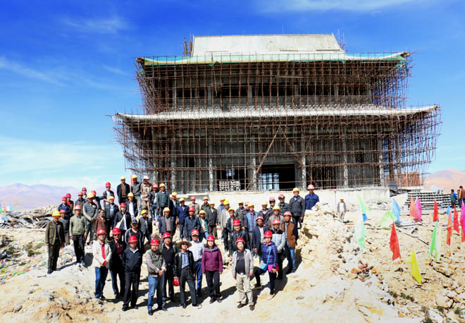 经过一年多精心设计,精心施工,关帝庙大殿土建工程已经屹立在岗嘎山头。2015年9月9日,崔玉晶女士率领装修团队,来到珠峰脚下,验收土建工程,带装修队伍进场。