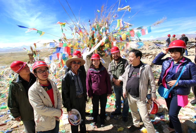 湖北省政协杨松主席(中)、西藏自治区政协副主席阿佩晋美(右)、日喀则市长张洪波(左)、沈阳德源集团崔玉晶董事长(左二)、湖北省委统战部海外中心主任朱正明(右二)在岗嘎山头考察珠穆朗玛关帝庙遗址
