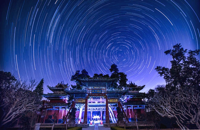 这是记者薛俊拍摄的夜空轨迹:漫天星河,似乎映照着解州关帝庙春秋楼内的关帝爷,夜读春秋……
