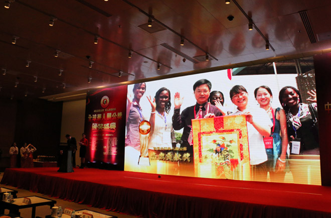主席台大屏幕播放朱正明走遍天涯寻访传播关帝文化的图片故事